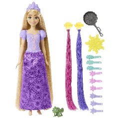 ロングヘアの「ラプンツェル」のドールはパープルのドレスを着ていて、フライパン型のブラシ、ティアラ、3つのヘアクリップでヘアアレンジ遊びもできます☆