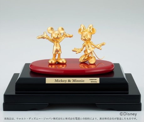 「ミッキーマウス」と「ミニーマウス」の純金オブジェ。