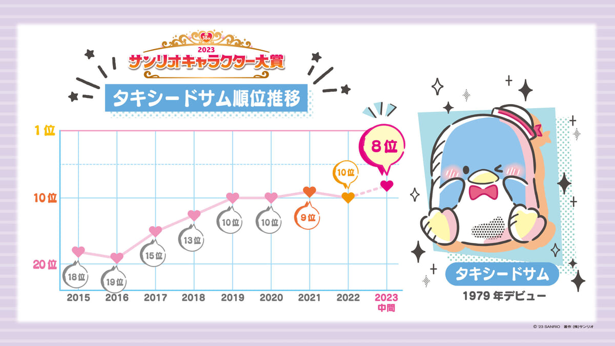 また、2023年でデビュー30周年を迎えた「バッドばつ丸」(2022年12位)は10位にランクインし、12年ぶりのTOP10入りが期待されます。