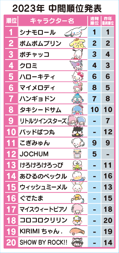 2位に「ポムポムプリン」(2022年2位)、3位に「ポチャッコ」(2022年4位)がランクインし、中間順位TOP3をサンリオ3大“犬キャラクター”が独占する結果となりました。