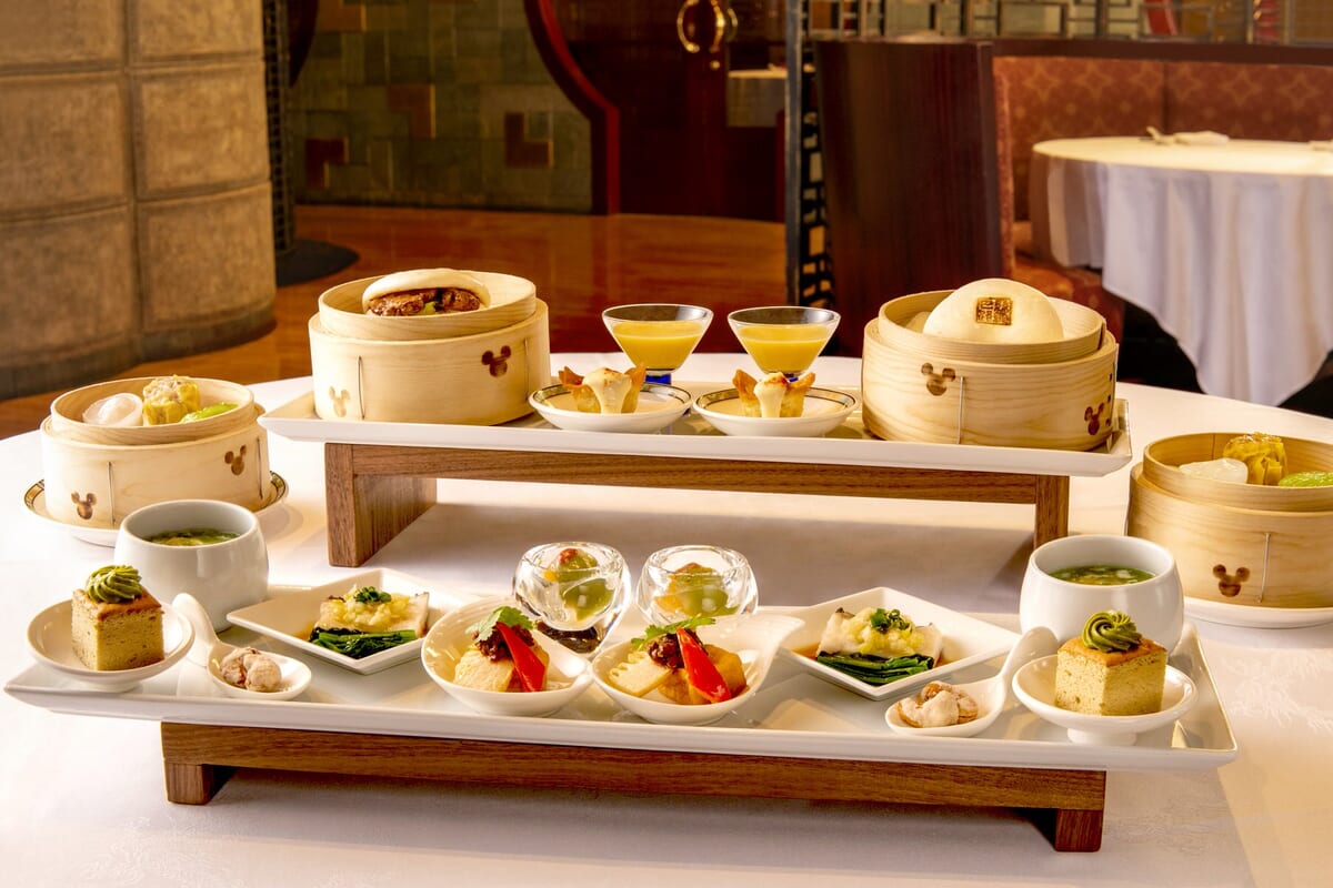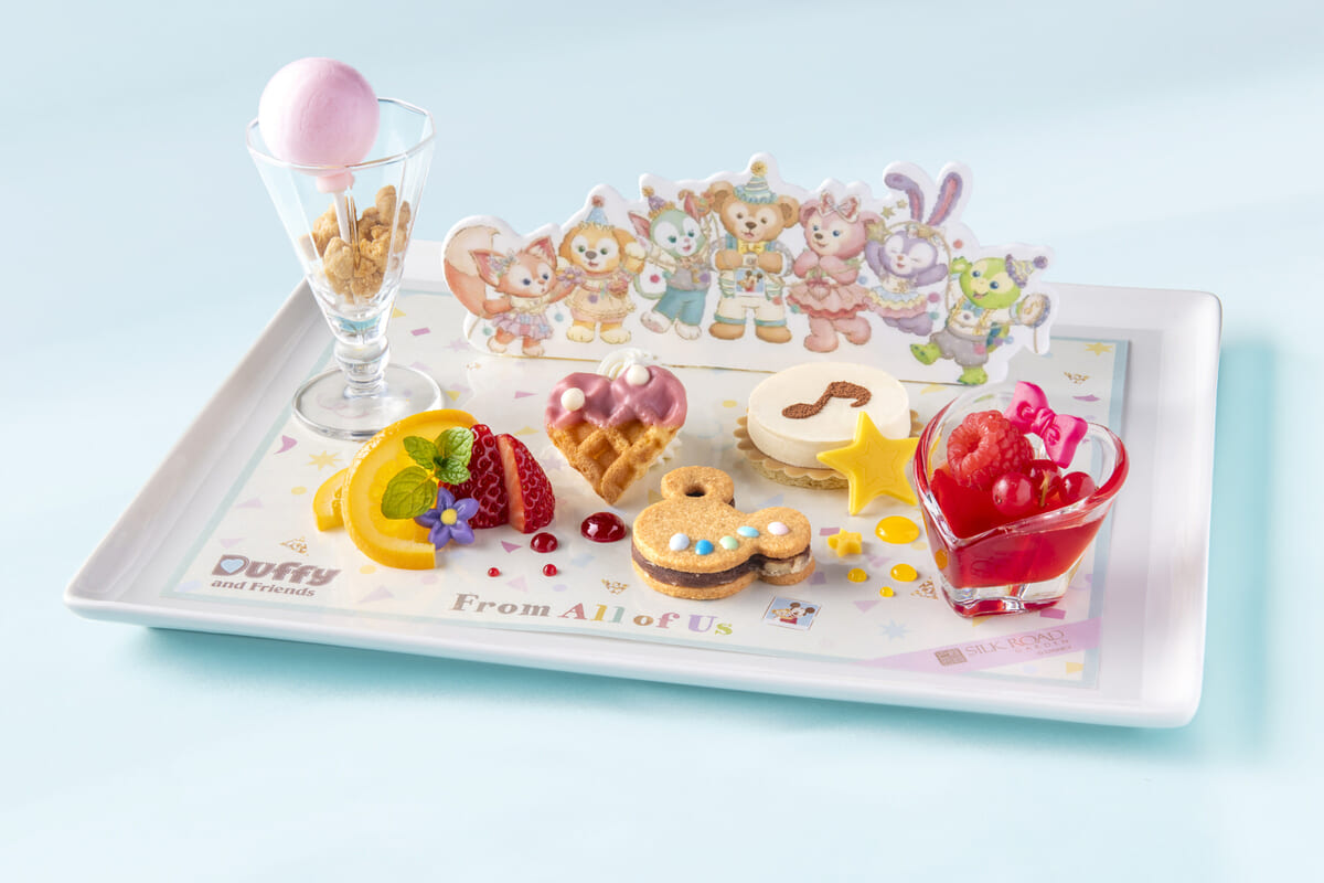 ジェラトーニのパレットやオル・メルのタンバリンなど、ダッフィー&フレンズのプレゼントを表現した心あたたまるデザートプレートと、点心や中華バーガーといったバラエティ豊かなメニューを楽しめます。