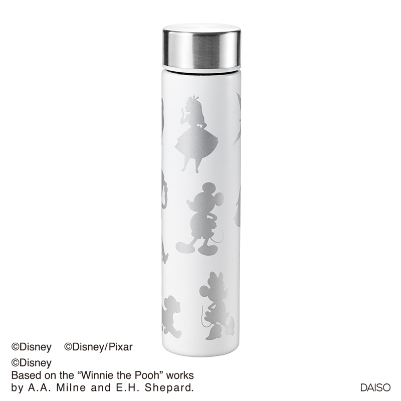「ミッキーマウス」や「ミニーマウス」、『不思議の国のアリス』の「アリス」たちのシルエットが配されたステンレスボトル。