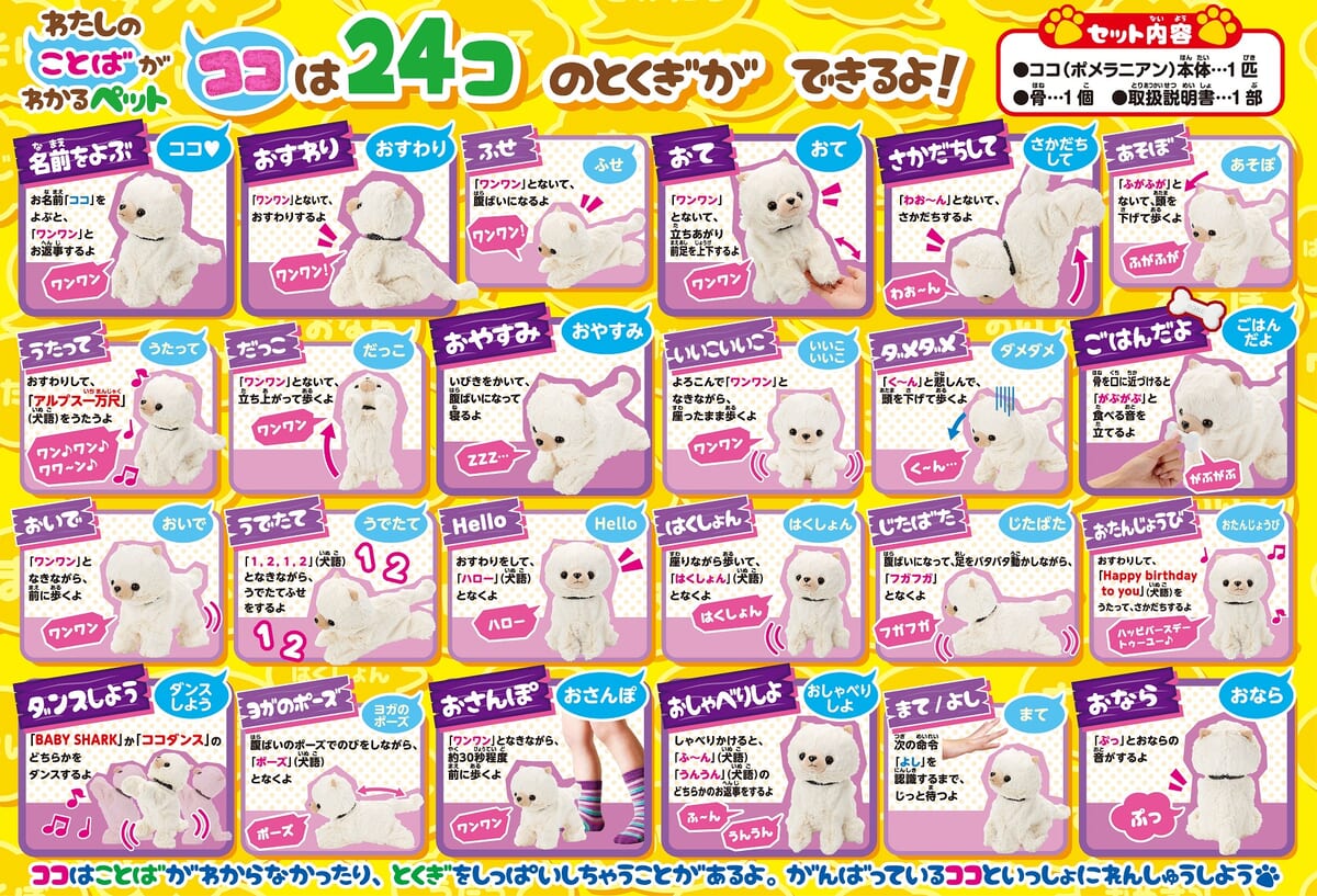 ほかにもダンスやおならなど、合計24種類の言葉に反応し、本物のペット顔負けの特技で場を盛り上げてくれる存在です。