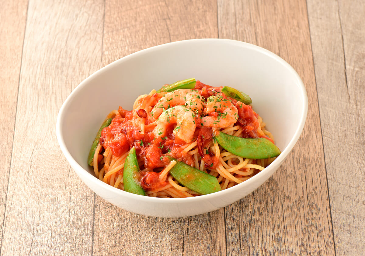 海老のぷりぷり感とほんのりピリ辛な「パスタ 海老とスナップえんどうのピリ辛トマトソース」も同時販売されます☆