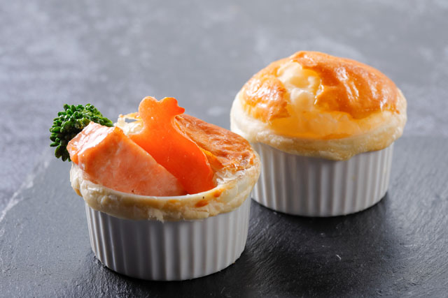 第1弾の3月27日から4月28日は、サクサクのパイを崩しながら食べるシェフの遊び心がたっぷり詰まった「サーモンと菜の花のクリーム煮 パイ包み」と、
