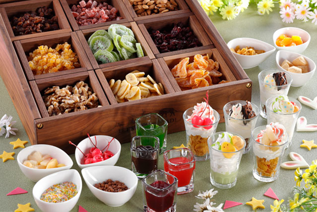 食後のデザートには、「手作りパフェコーナー」でケーキやコーンフレーク、ドライフルーツなどの充実したトッピングが用意されており、色々なデコレーションパフェを楽しむことができます。