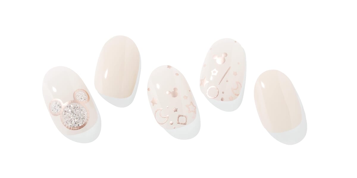 「ミッキーマウス」のアイコンを用いた普段使いしやすいネイルは、肌馴染みのよい端正なベビーピンクをベースにローズゴールドやシルバーでモチーフをちりばめ、上品で軽快感のある仕上がりです。