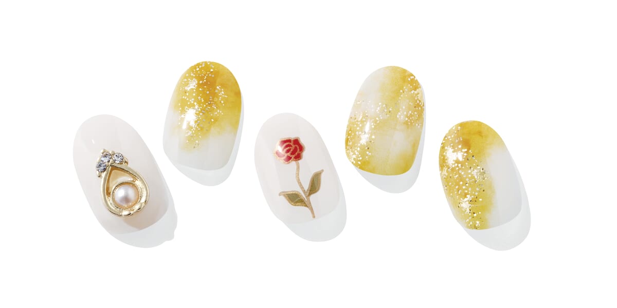 『美女と野獣』の物語のキーアイテムである薔薇の花と、主人公「ベル」の美しいイエローのドレスをイメージしたネイルになっています。