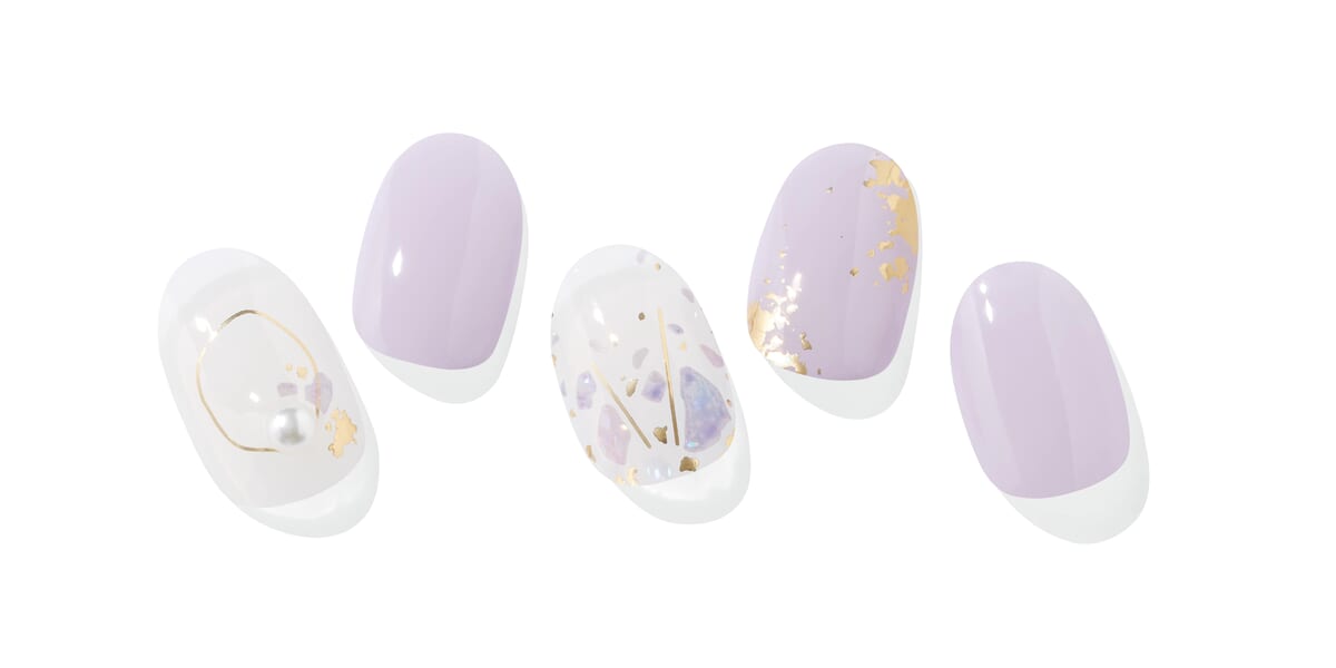 薄紫のネイルに光の反射で表情が変わるマーメイドパウダーをのせ、シェルやゴールドラインの輝きがファンタジックな世界を演出してくれます。