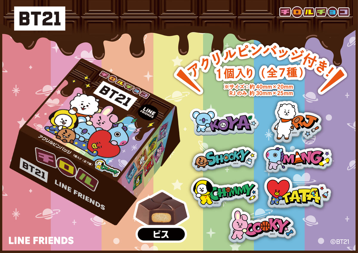 CHIMMYやCOOKY、RJたちのアクリルピンバッジ付き!チロルチョコ「ビッグチロル<BT21>」