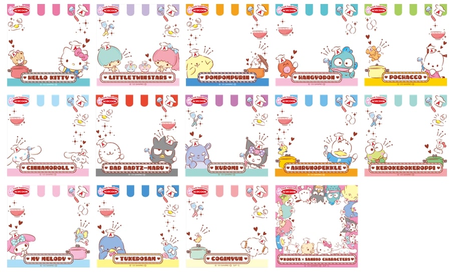 「ハローキティ」「ポムポムプリン」「ポチャッコ」「シナモロール」「クロミ」「マイメロディ」などサンリオのキャラクターたちが描かれた愛らしいデザインです。