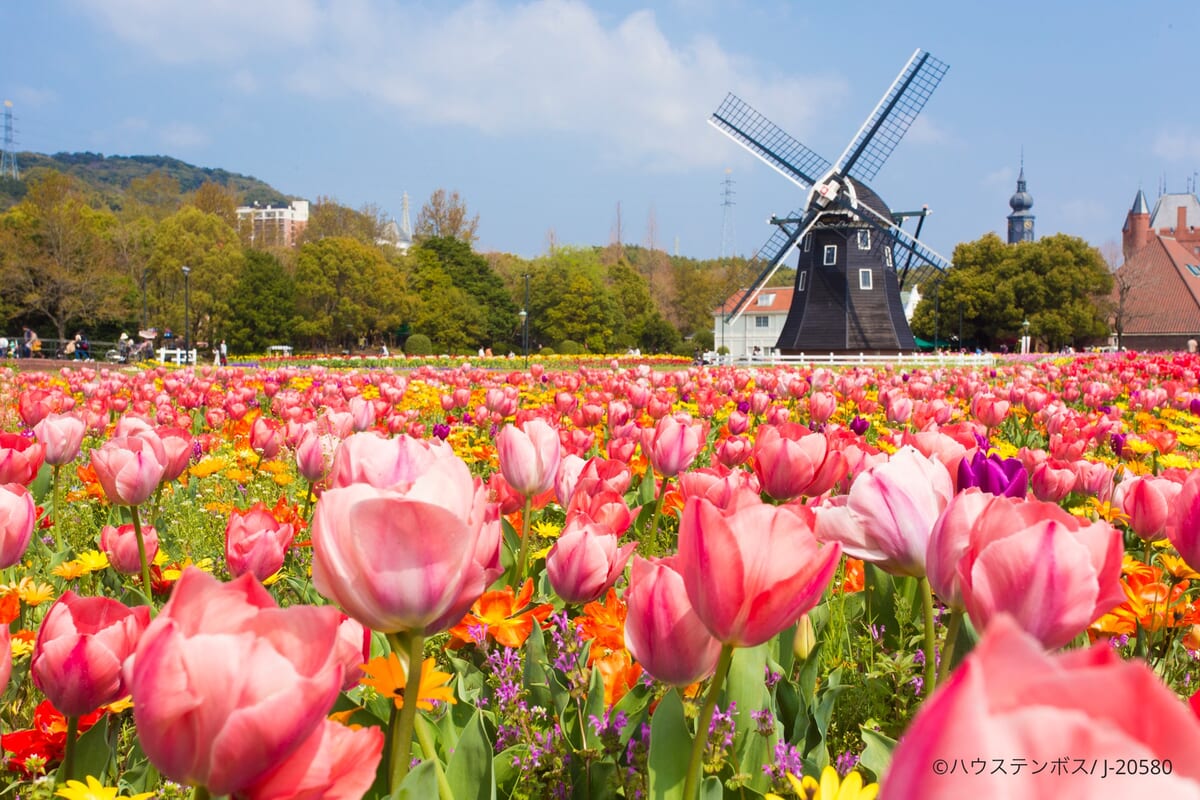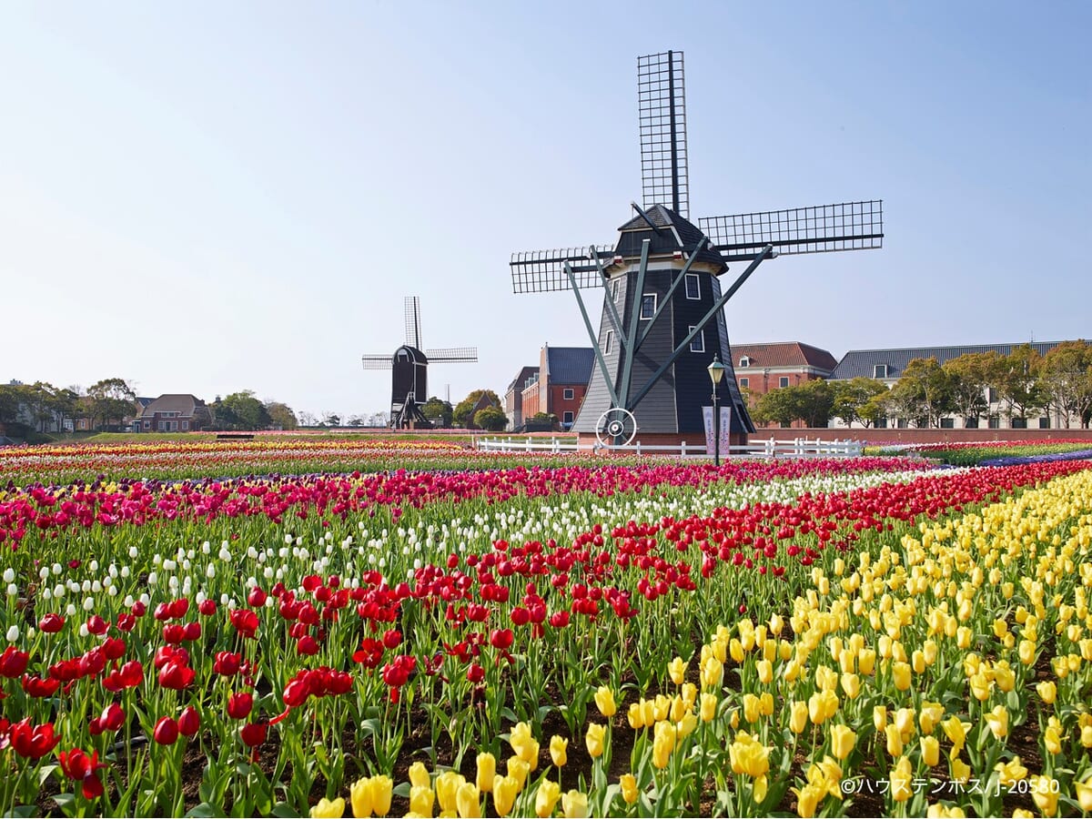 風車の前に広がるチューリップ畑は息をのむほどの絶景で、人気の撮影スポットでもあります。