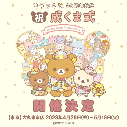 サンエックスの人気キャラクター「リラックマ」が、2023年で20周年を迎えるのを記念して、2023年4月28日より「祝・成くま式」を開催。