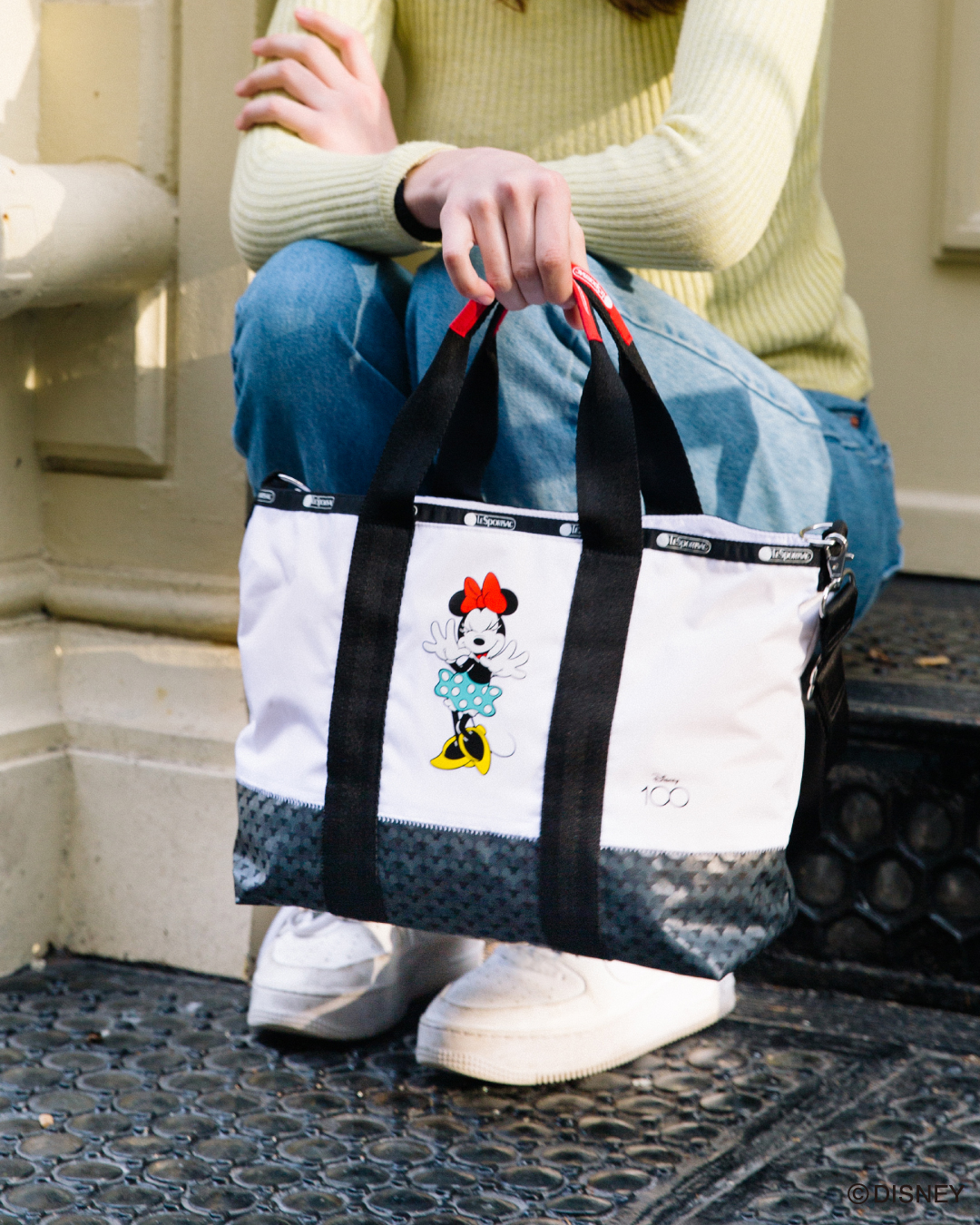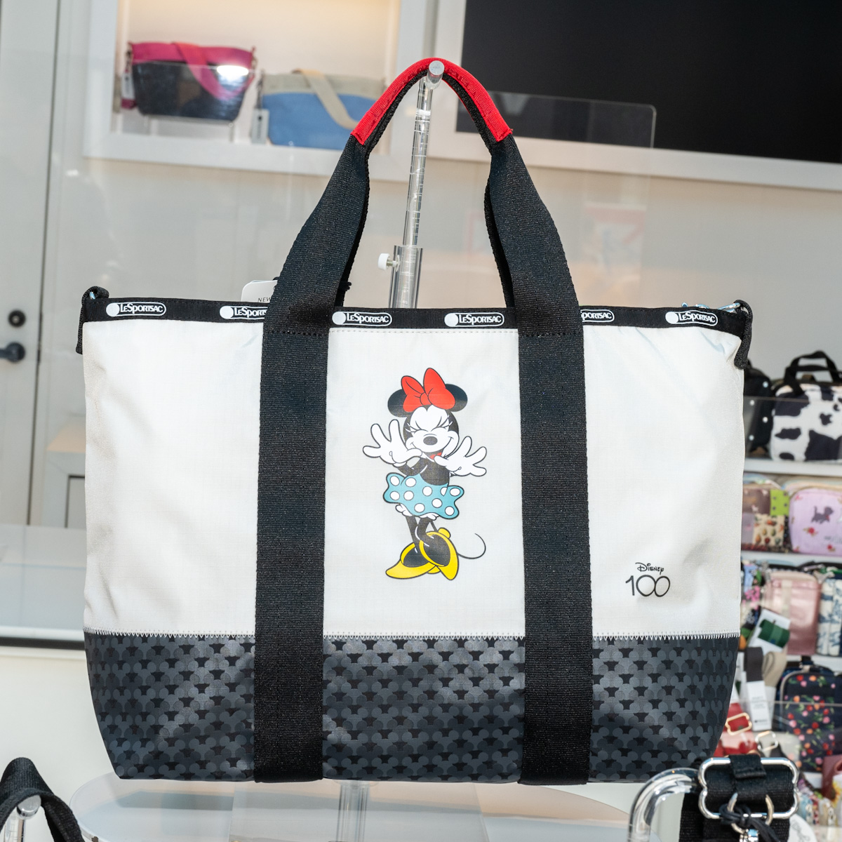 「Disney100」のロゴと「ミニーマウス」がデザインされたトートバッグ。