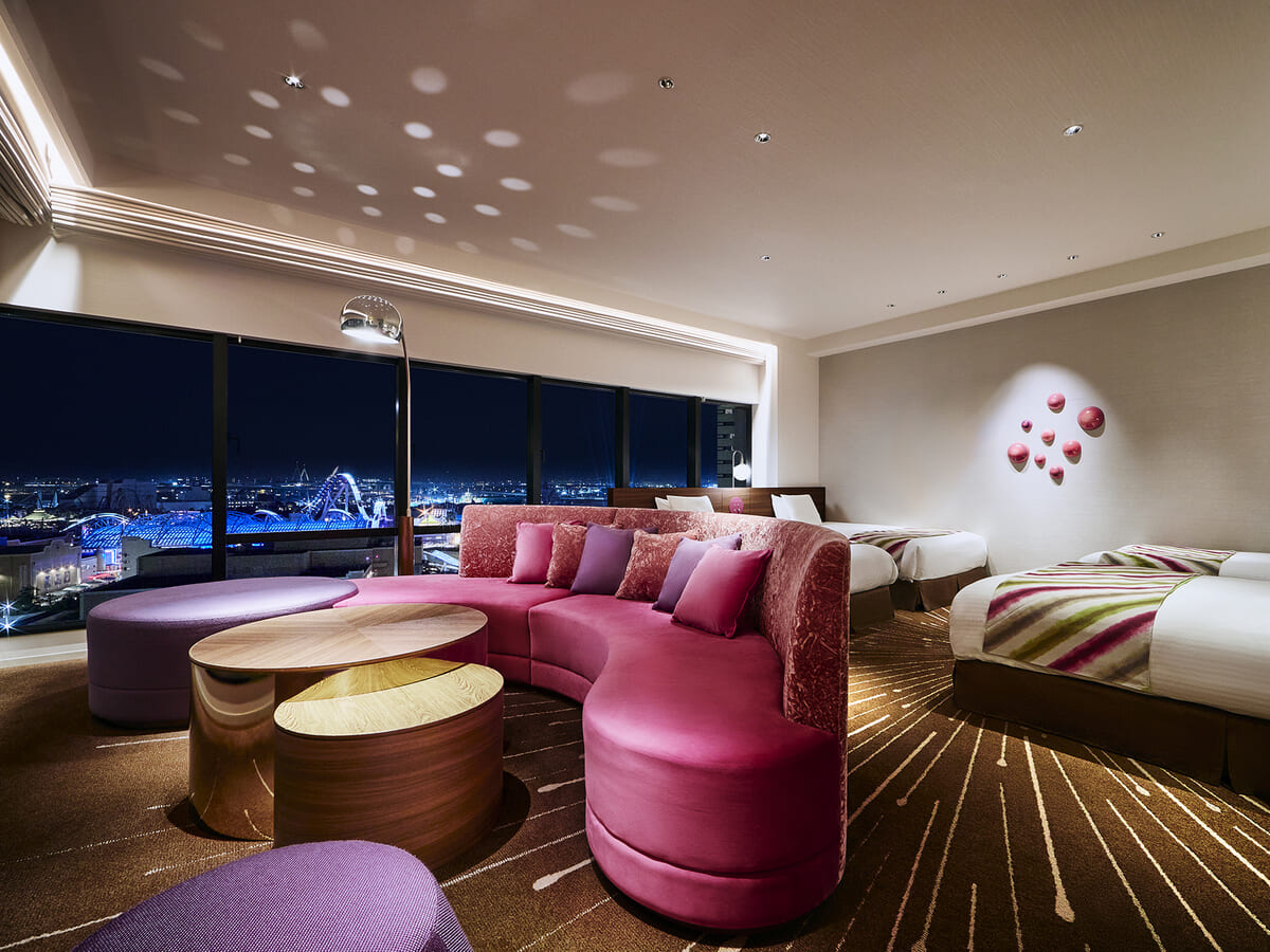 ソファでくつろぎながら、2面の大きな窓の外に広がる、ユニバーサル・スタジオ・ジャパンの華やいだ景色を望めます。