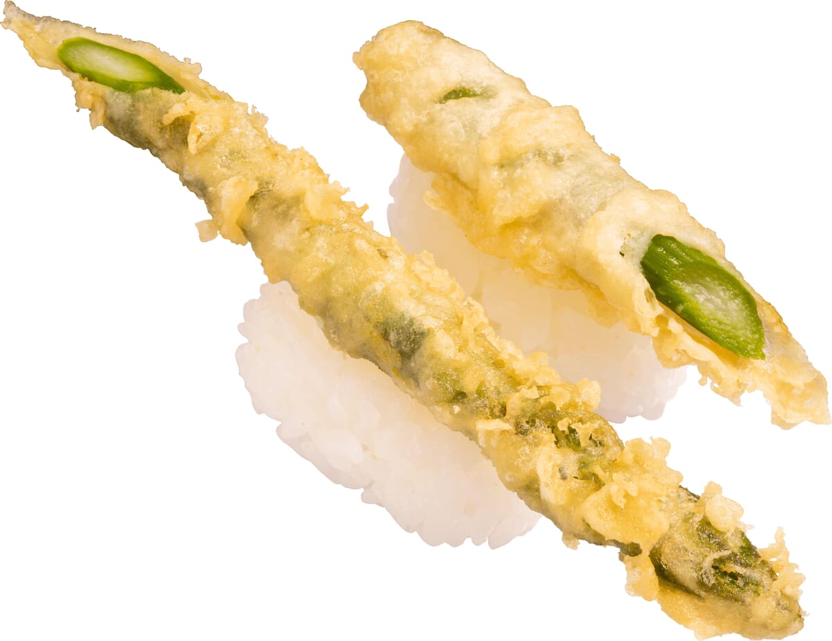 歯切れの良いアスパラを天ぷらに仕立てた「アスパラ天にぎり」