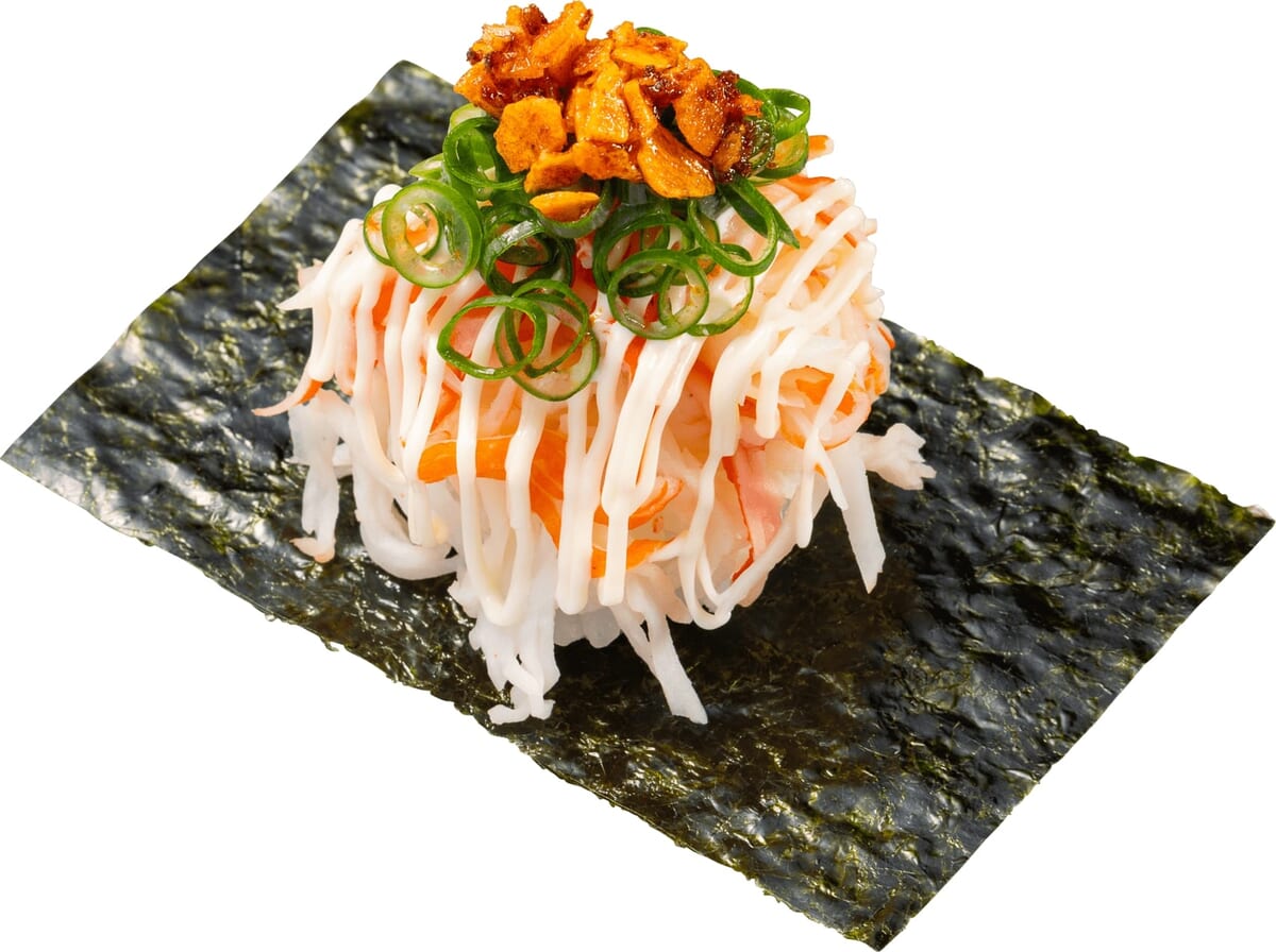 ザクザク食感の旨ラー油をのせた「こぼれカニカマザク旨ラー油マヨ包み」
