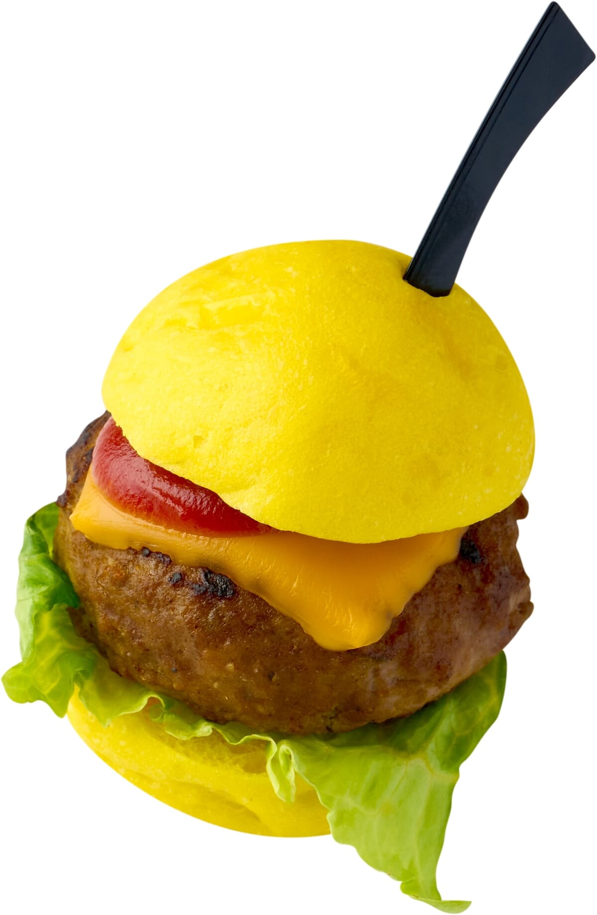 黄色のバンズでピカチュウを イメージしたケチャップたっぷりの肉厚バーガー。