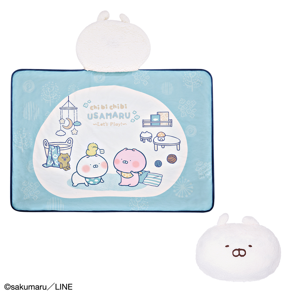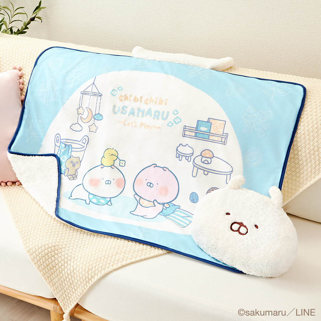 「ちびちびうさまる」のおかお型収納ポケットにブランケットを入れると、クッションにもなるすぐれものです。