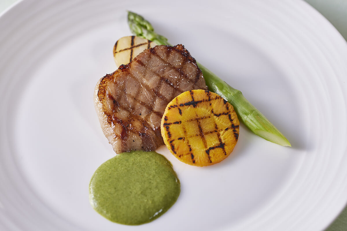 「松阪ポークのグリル」は脂身まで美味しく、濃厚なグリーンカレーソースにも負けない、力強い肉の旨味が楽しめます。
