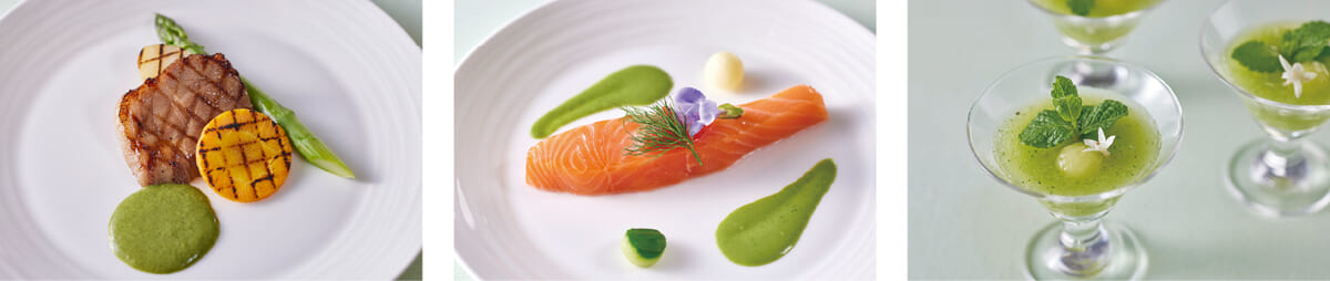 アスパラガスやそら豆、ハーブにメロンなどを使った、洋食・和食・デザートなど約60種類のメニューが提供されます。