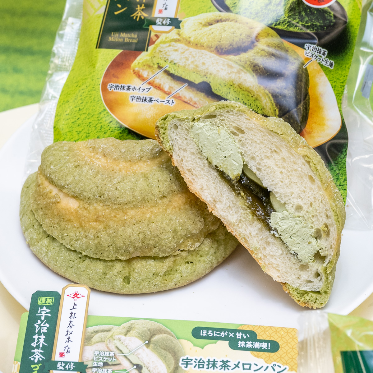 宇治抹茶を加えたビスケット生地のメロンパンに、宇治抹茶を加えたほろ苦い抹茶ペーストと抹茶ホイップをサンド。