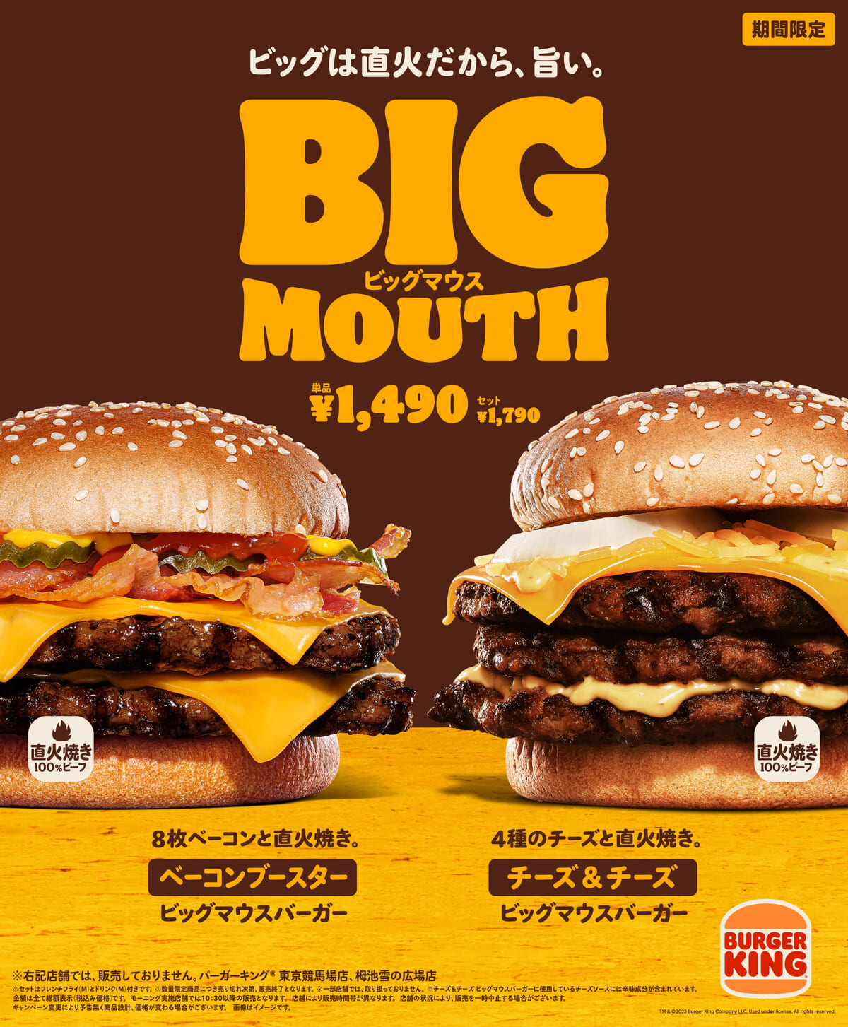 スモーキーなベーコン8枚と直火焼きのビーフパティ2枚の旨さが口いっぱいに広がる「ベーコンブースター ビッグマウスバーガー」と、4種のチーズに直火焼きのビーフパティ3枚を重ねた「チーズ&チーズ ビッグマウスバーガー」販売されます。