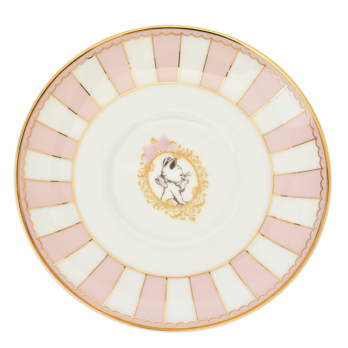 パステルピンク×ホワイトのストライプ柄で仕上げられた『おしゃれキャット』の「マリー」がデザインされたカップ&ソーサー。
