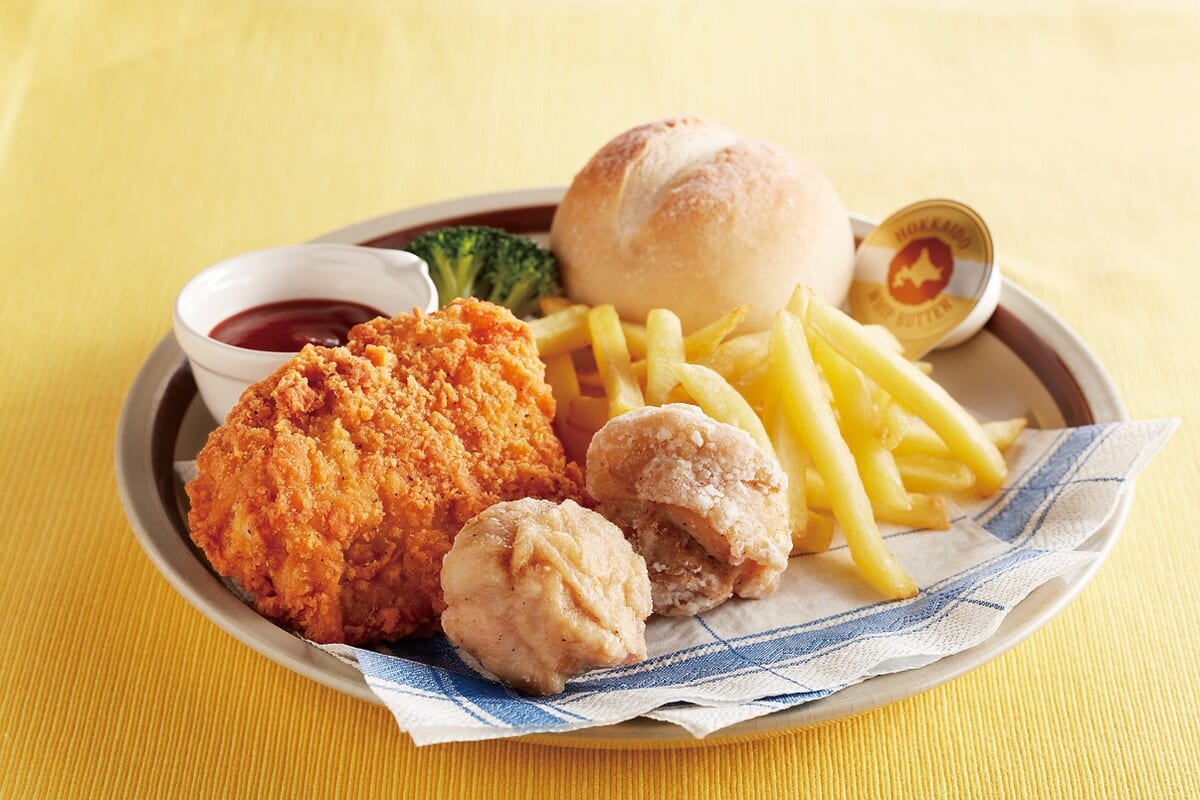 カリッと香ばしいフライドチキンに唐揚げ、ポテトフライ、パンが盛り付けられた贅沢なメニュー。