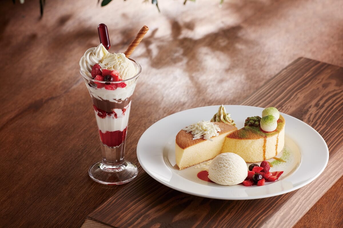 斜めにカットされたパンケーキは、黒蜜・抹茶をかけた和風と、ホワイトチョコを盛り付けた洋風の2つの味が楽しめます☆