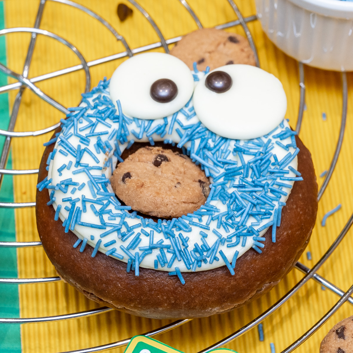 「クッキーモンスター」が大好きなクッキーをドーナツの穴にトッピングすることで、クッキーを口にくわえているような、食いしん坊な表情に仕上げられています。