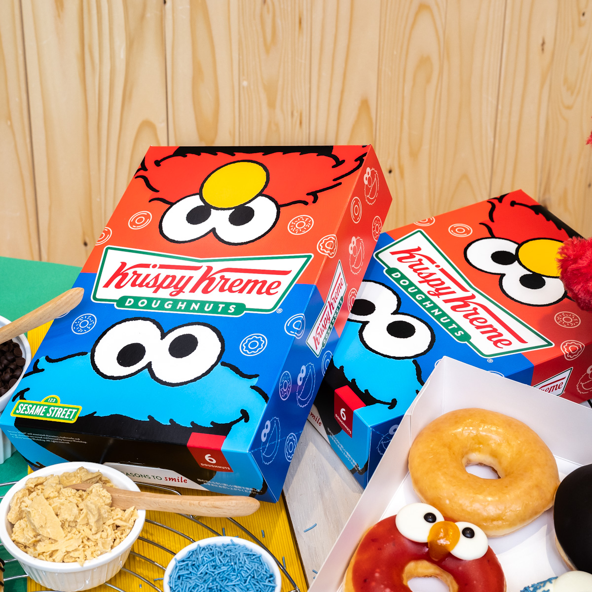「エルモ ストロベリー」、「クッキー クリーム & クッキー モンスター」、「チョコチップ クッキー」のほかにも、「オリジナル・グレーズド(R)」と「チョコ カスタード」も集まった贅沢なボックスです。