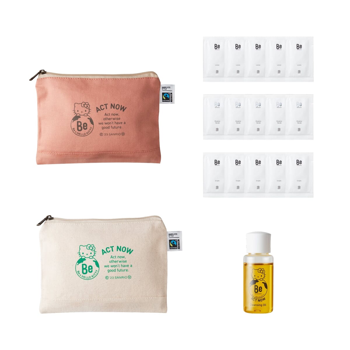 「Be」が2023年アースデイのテーマとしている「ACT NOW」を「ハローキティ」が掲げているデザインを使った巾着やポーチ。