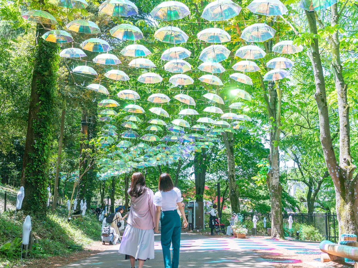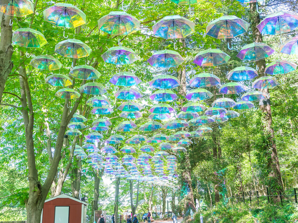 太陽の光によって複雑な色合いを作り出すアンブレラのアーケードの下を、ふわふわとシャボン玉が漂い、虹色に輝く幻想的な光景が楽しめます。