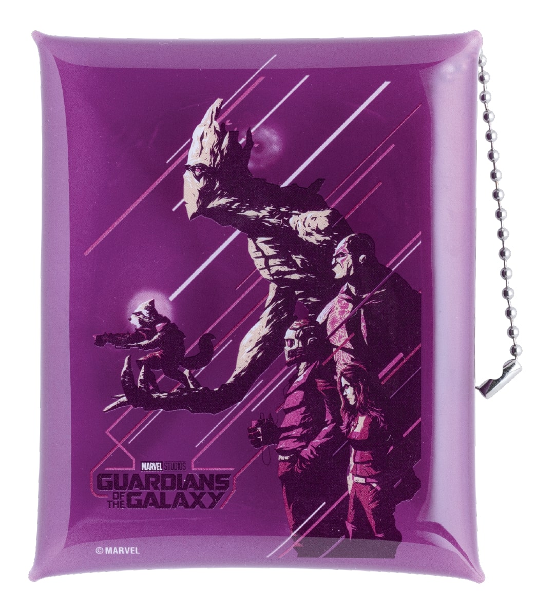 「ロケット」を手に乗せた「グルート」をプリントしたパープルのクリアマルチケースや、