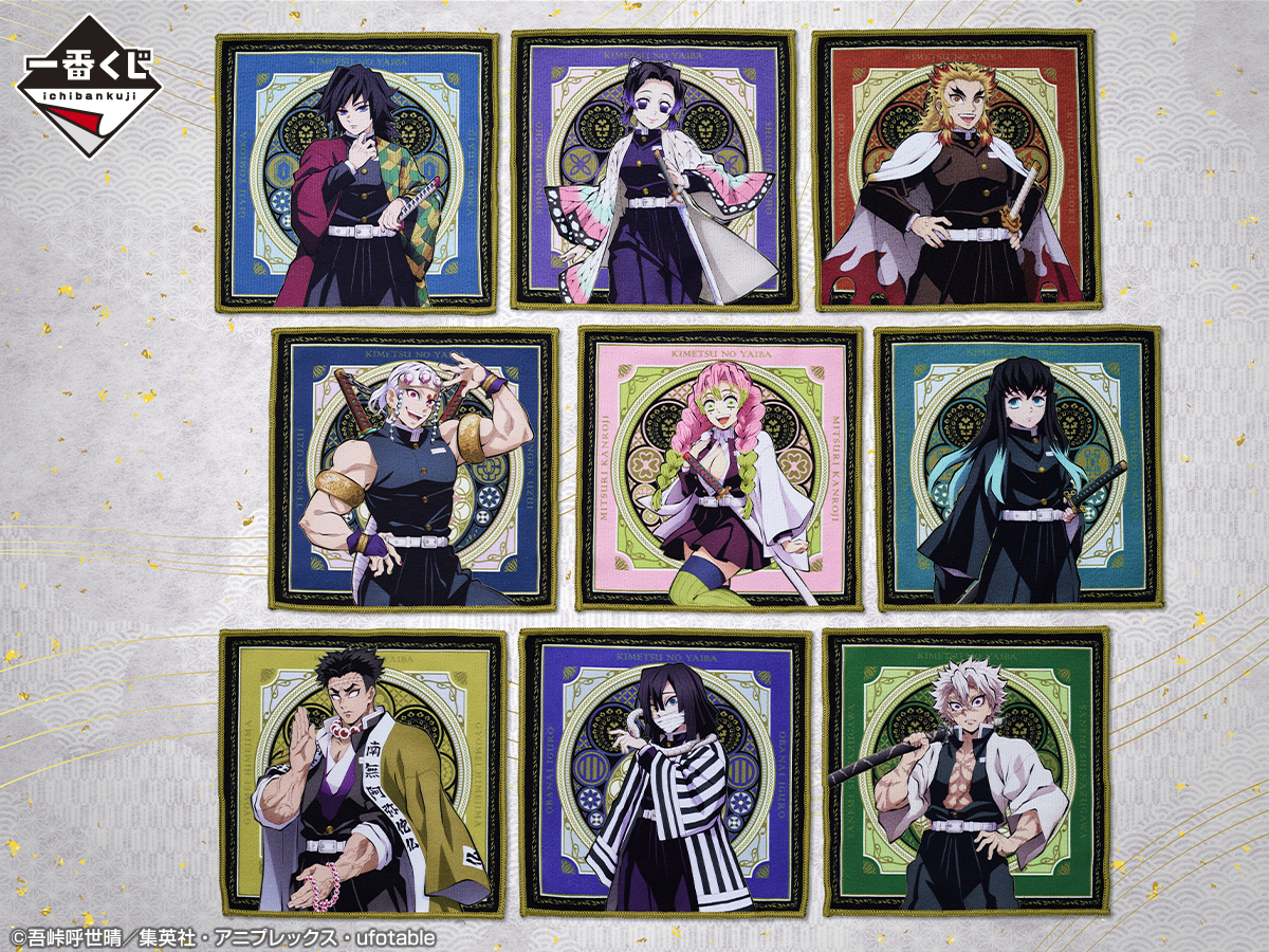 「竈門炭治郎」や「我妻善逸」「嘴平伊之助」たちがデザインされたハンドタオルがE賞に登場。