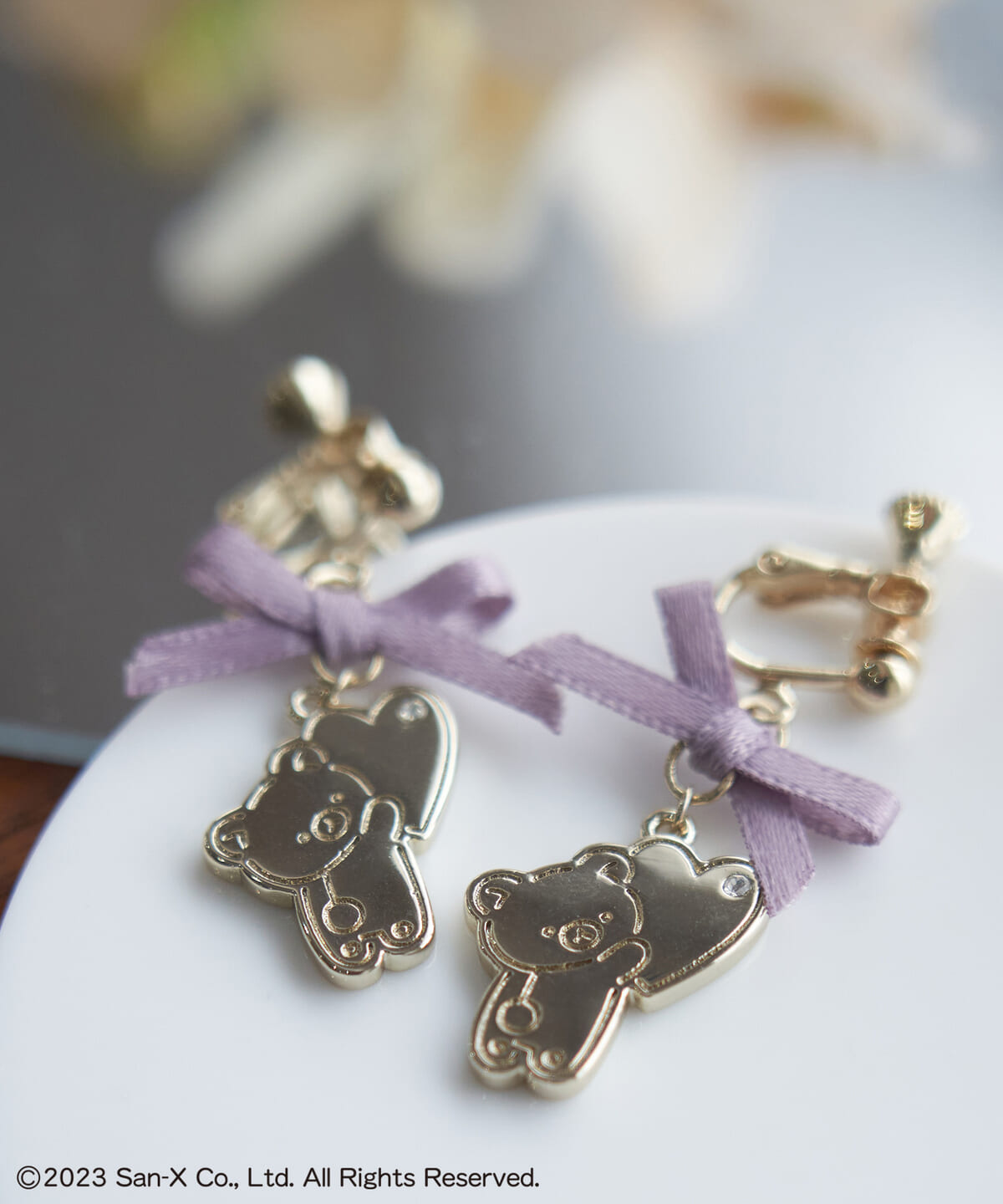 「リラックマ」のメタルモチーフと小さなサテンリボンを合わせたイヤリング。