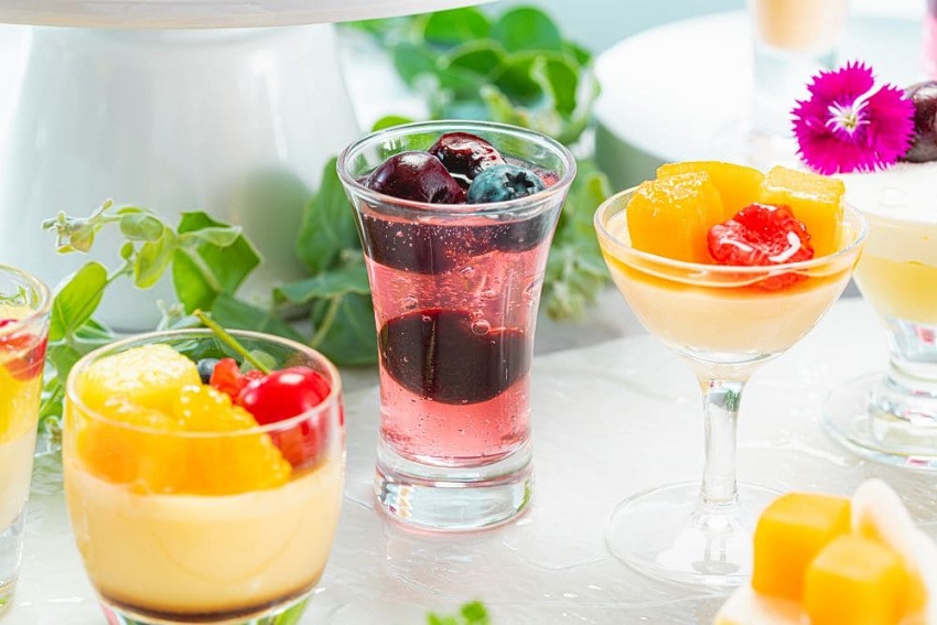 - スイーツ12種:赤肉メロンショートケーキ/ショコラスリーズ/プリンアラモード/メロンシュークリーム/赤肉メロンムース/ミルクレープ/ココナッツブランマンジェ/タルトスリーズピスターシュ/メロンスムージー/チェリーシャンパンジュレ/サワーチェリームースケーキ/ヴェリーヌチェリー