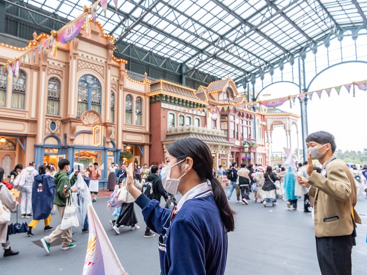 40周年となる当日、ワールドバザールでは、入園してくるゲストをキャストがお出迎え。