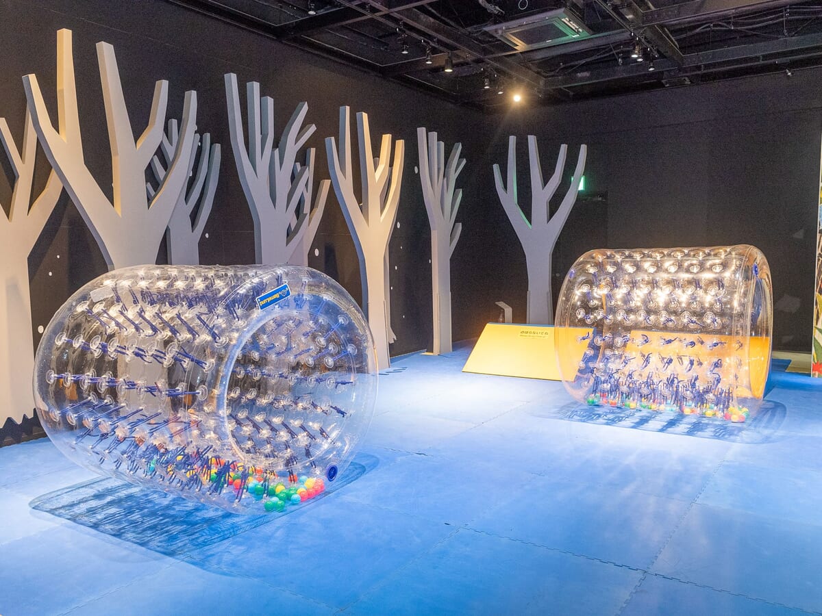 空気の入った弾力のある床面や壁にぶつかって、ジャンプして、転がって、反発力を楽しみます。