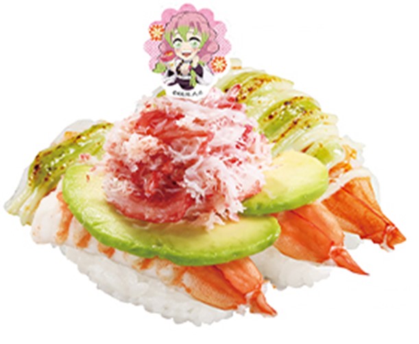 「甘露寺蜜璃」のチャームポイントの一つである髪色を、旨味たっぷりのカニ身と、色鮮やかなアボカドで再現。
