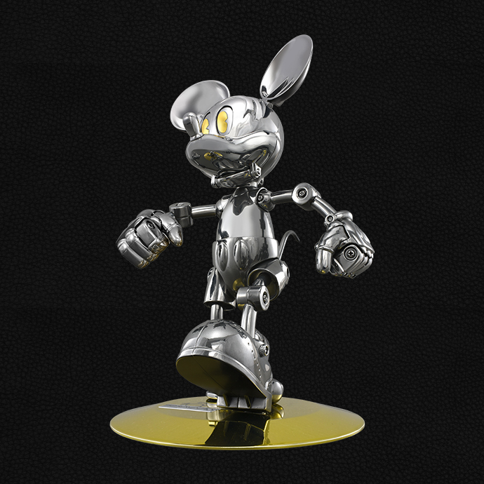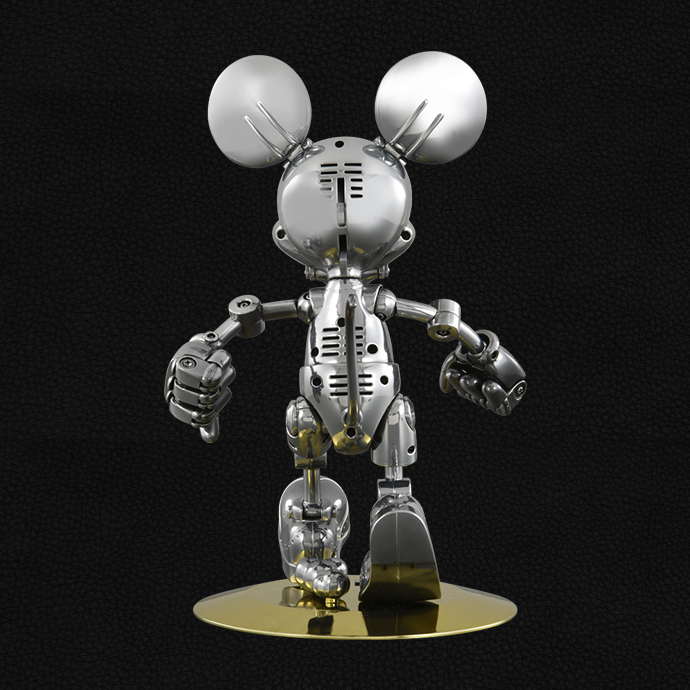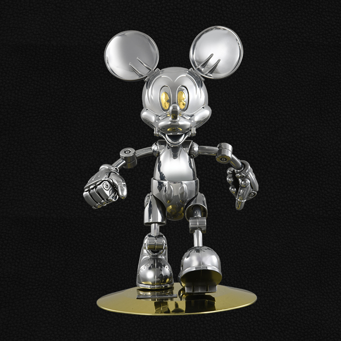 空山作品の特徴であるシャイニー感を表すために、素材は重量感のあるダイキャスト製品としながら、生き生きとしたミッキーマウスの表情を再現するために約15か所以上が可動式になっています。