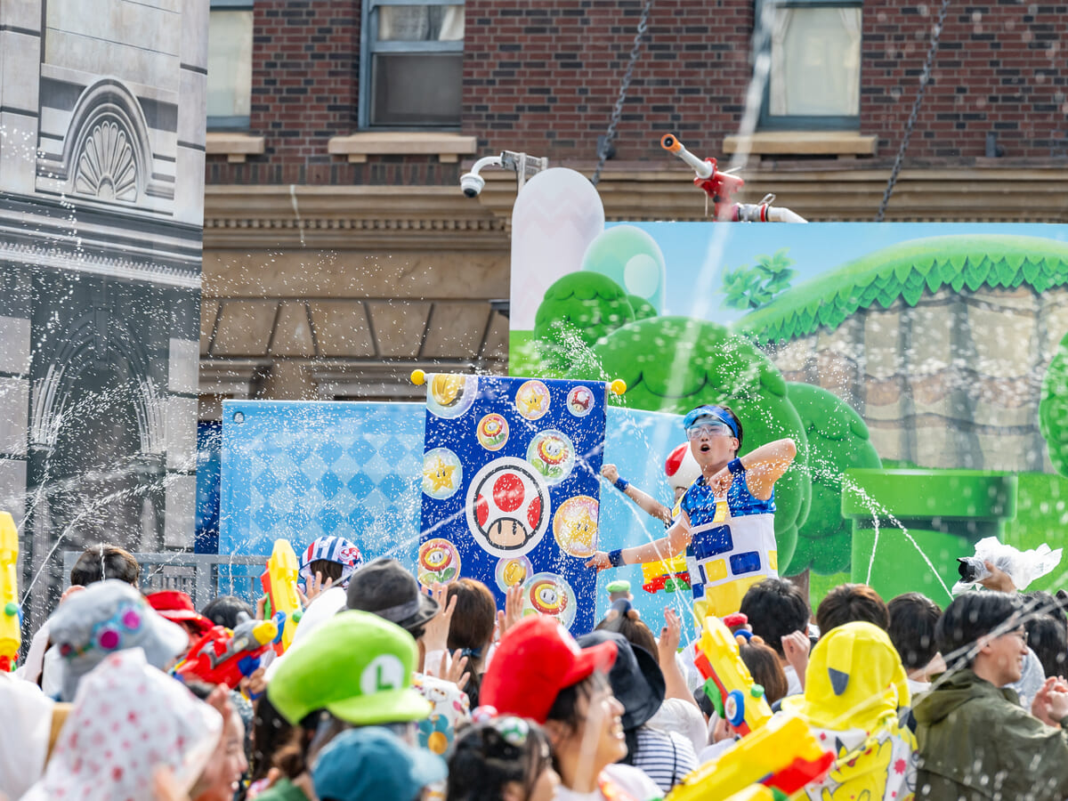 スーパー・ニンテンドー・ワールドから飛び出したマリオやルイージ、キノピオやピーチ姫と、水かけまつりで大盛り上がり!