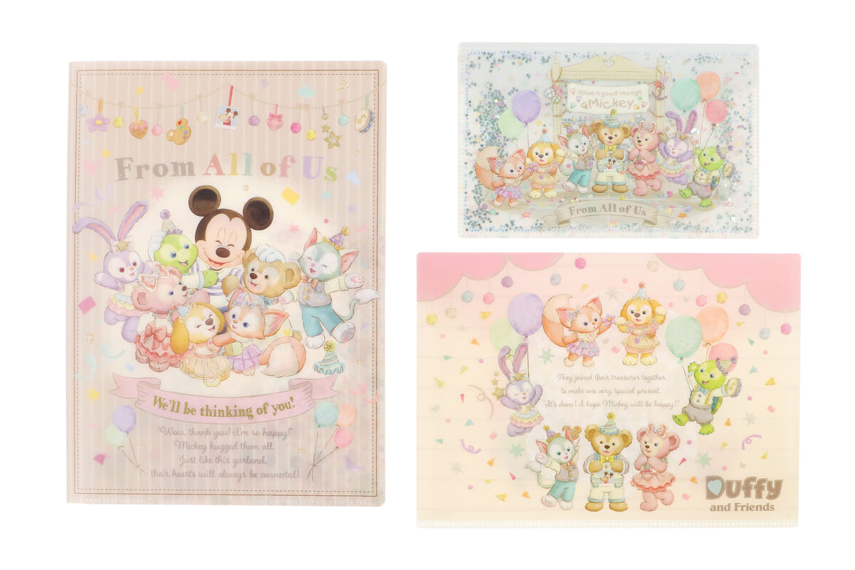 今回は、ダッフィー&フレンズからプレゼントを受け取ったミッキーマウスを囲んで、みんなが笑顔になる様子をデザインしたグッズを紹介していきます。