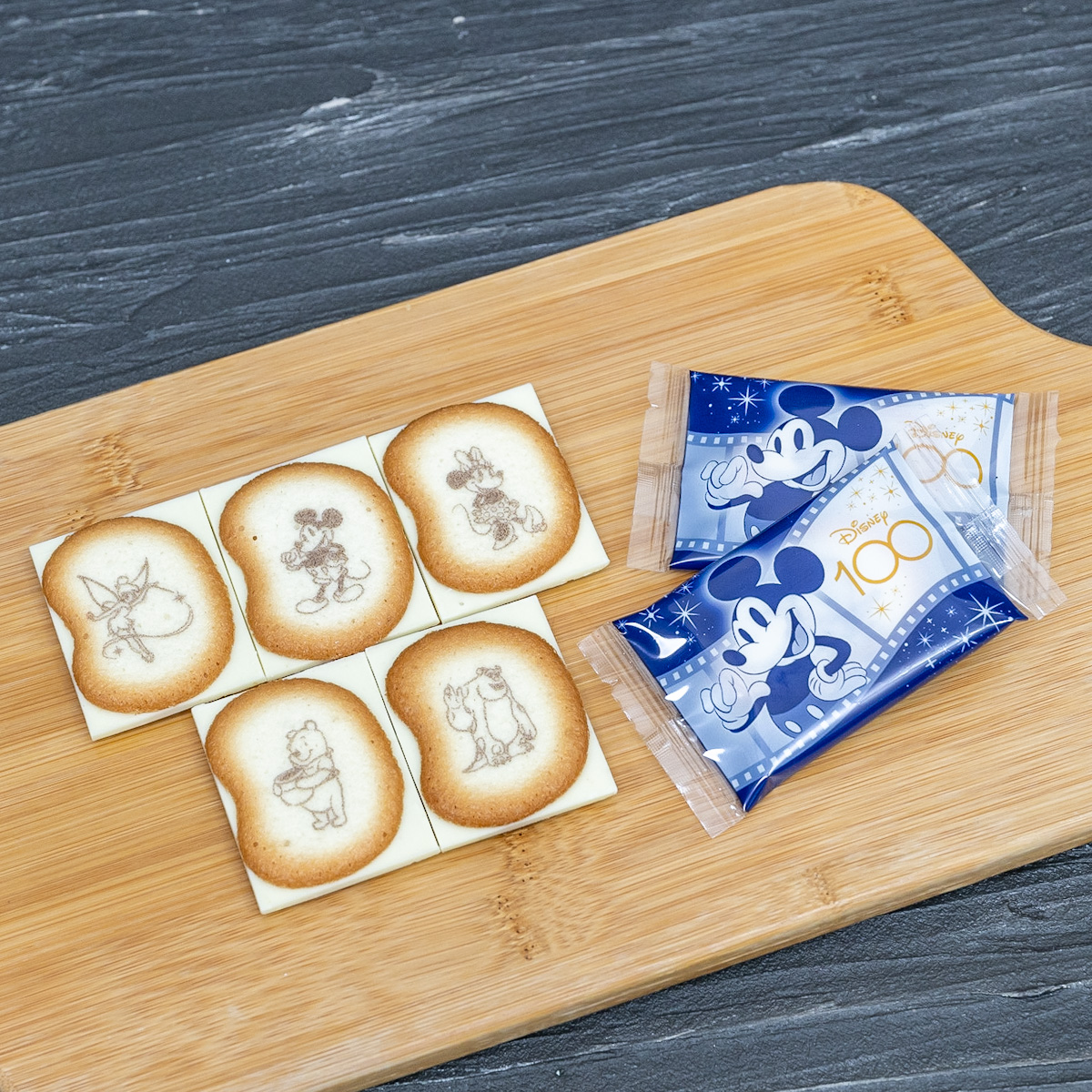 ラングドシャクッキーのデザインは「ミッキーマウス」「ミニーマウス」「くまのプーさん」「ティンカー・ベル」『モンスターズ・インク』の「サリー」の人気キャラクター5種類。