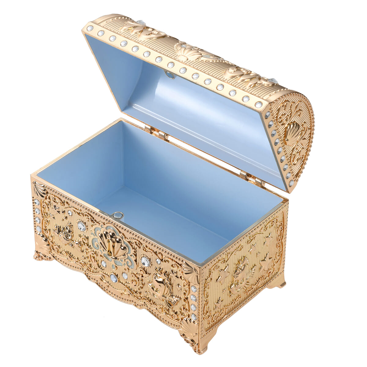 アリエル、フランダー、セバスチャンをデザインした、宝箱風の小物入れ。