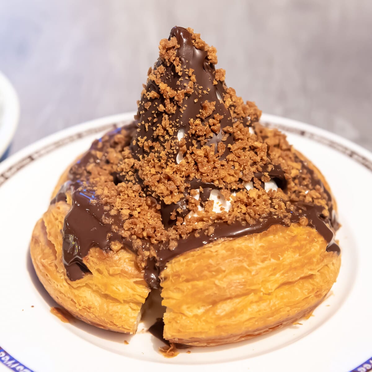 ほかほかのデニッシュとソフトクリームの上からチョコレ―トソースとザクザクのクランチをたっぷりかけた「シロノワール ブラックモンブラン」