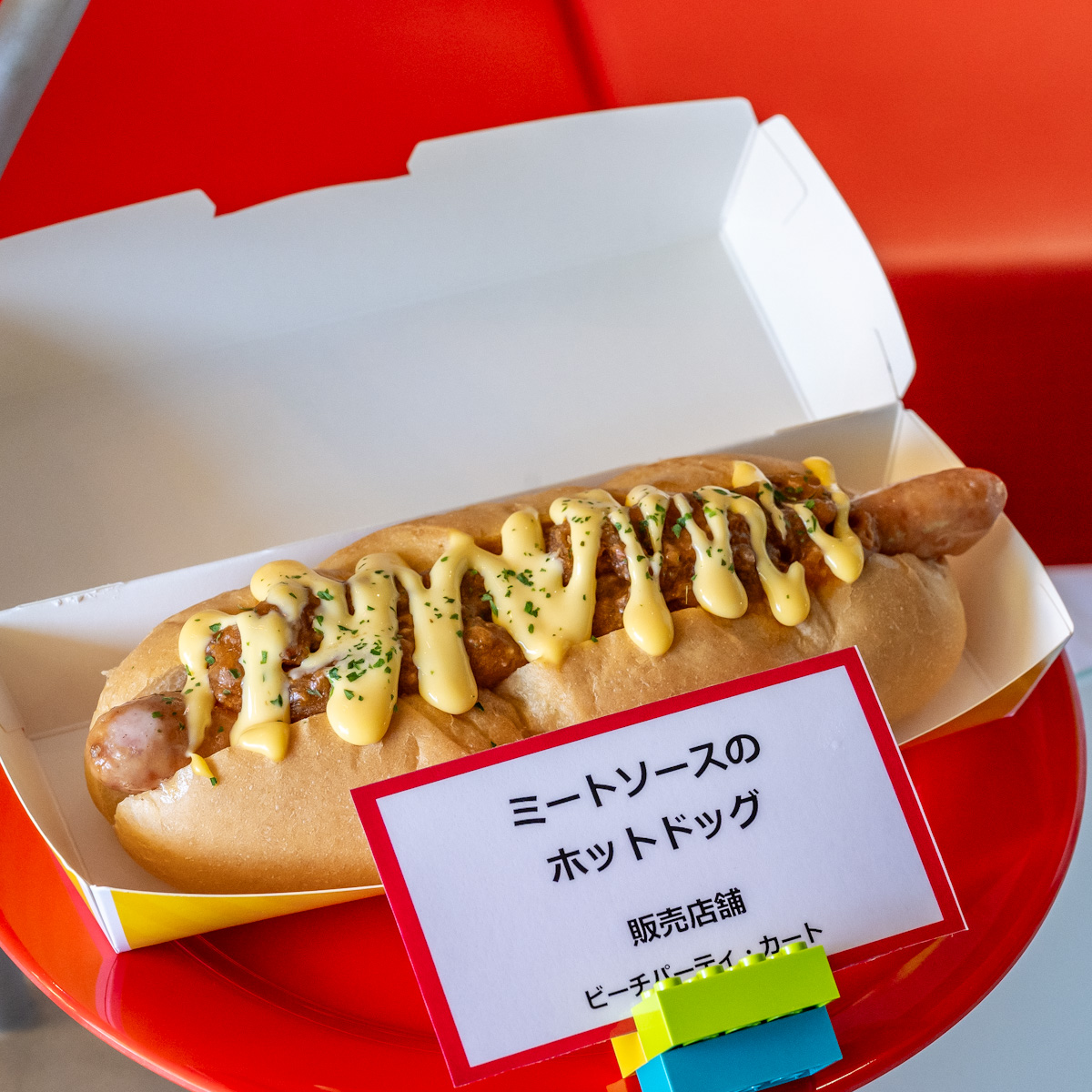 大きなソーセージをサンドしたホットドッグに、ミートソースをトッピングしたメニュー。