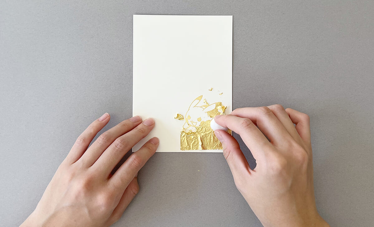 そのため、金箔を貼り付け、コットンで余分な金箔を剥がすだけで小さなお子さんでも簡単にピカチュウの金箔ハガキが作れる体験です。