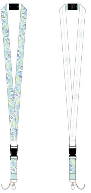ピアノ鍵盤と音符、「ミッキーマウス」のシルエットが描かれた、コンサートにぴったりなデザインのネックストラップ。